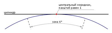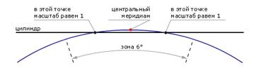 В проекции Гаусса-Крюгера цилиндр касается эллипсоида по центральному меридиану, масштаб (scale) вдоль него равен 1, рис.16.