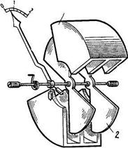 На рисунке представлен прибор с поверхностным измерительным механизмом. Он состоит из неподвижных электродов 1 и подвижных электродов 2, укрепленных на оси. Электроды выполняются из алюминия. Измеряемое напряжение U, приложенное к неподвижным и подвижным электродам, создает между ними электростатическое поле, энергия которого