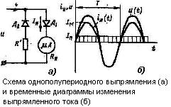 При измерении переменных токов и напряжений звуковых частот используют многопредельные выпрямительные амперметры и вольтметры, представляющие собой сочетание шунтов или добавочных резисторов, полупроводниковых одно- или двухполупериодных выпрямителей и магнитоэлектрического микроамперметра. Показания выпрямительных приборов соответствуют средневыпрямленному значению измеряемого напряжения или тока, т. е. магнитоэлектрический измеритель усредняет значение предварительно выпрямленного тока.