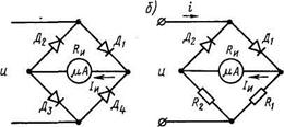 В цепи однополупериодного выпрямления почти все приложенное напряжение u(t) падает на диод Д1 поэтому при малых напряжениях работа диода осуществляется на линейном участке его вольтамперной характеристики и шкала прибора делается более линейной. В цепи же двухполупериодного выпрямления приложенное напряжение распределяется между двумя диодами и прибором, что приводит к расширению нелинейного участка шкалы. Входное сопротивление цепи двухполупериодного выпрямления одинаково для обеих полуволн измеряемого напряжения, но вследствие нелинейного характера сопротивлений диодов сопротивление цепи зависит от значения измеряемого тока, поэтому для определенности принято сопротивление указывать при номинальных значениях напряжения и тока.