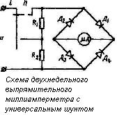 Расширение пределов измерения и возможность использования на различных, пределах измерения переменного тока общей шкалы обеспечиваются с помощью универсального шунта. Расчет шунта в многопредельных амперметрах, работающих в области звуковых частот, выполняется теми же способами, что и в многопредельных магнитоэлектрических амперметрах, только вместо сопротивления измерительного механизма необходимо учитывать и входное сопротивление измерительного выпрямителя, предельные значения измеряемого тока и падения напряжения на выпрямителе с учетом влияния элементов температурной и частотной компенсации. Для уменьшения температурной погрешности, вызванной изменением прямого и обратного сопротивлений диодов (обладающих отрицательным температурным коэффициентом), параллельно универсальному шунту включают дополнительный шунт, составленный из двух резисторов: один — из медной проволоки с положительным температурным коэффициентом, а второй — из манганиновой проволоки с высокостабильным сопротивлением.