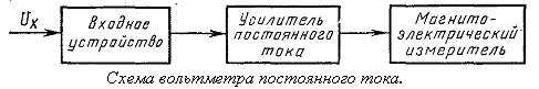 Вольтметр состоит из входного устройства — высокоомного резистивного делителя напряжения; электронного преобразователя — усилителя постоянного тока; электромеханического преобразователя — магнитоэлектрического измерителя.