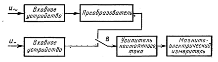 Универсальные аналоговые электронные вольтметры, предназначенные для измерений в цепях постоянного и переменного токов, реализуются так, как показано на рисунке: