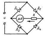 Наиболее распространенные схемы — мостовые. Они работают следующим образом. Ток через микроамперметр протекает в одном и том же направлении в течение обоих полупериодов переменного напряжения (в положительный полупериод по цепи Д2— R — Д3, а в отрицательный полупериод — по цепи Д4 — R — Д1). При использовании линейного участка характеристики диода и при открытом входе показания микроамперметра пропорциональны средневыпрямленному значению измеряемого напряжения. Если же вход преобразователя закрытый, то показания микроамперметра пропорциональны только средневыпрямленному значению переменной составляющей измеряемого напряжения.
