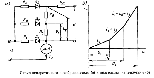 . Преобразователи выполняются на элементах с квадратичной вольтамперной характеристикой, при этом ток через микроамперметр пропорционален квадрату среднеквадратичного значения измеряемого напряжения, поданного на вход преобразователя.