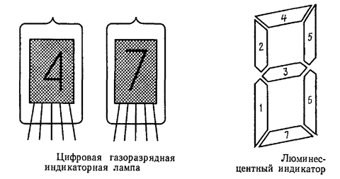 Знаковые индикаторы используют для представления результатов измерения в цифровой форме. Конструкция знаковых индикаторов может быть различна, например: индикаторы с лампами накаливания, выполненные в виде прозрачных пластин (светопровода) из оргстекла или люцита, на которых нанесены цифры и имеется боковая подсветка в торец лампочкой (число пластин соответствует числу индуцируемых знаков); индикаторы из газоразрядных счетных ламп (декатронов) и ламп типа ИН с анодами в виде сеток и катодами, выполненными в форме арабских цифр от 0 до 9 (число ламп должно соответствовать числу десятичных разрядов отсчетного устройства); люминесцентные мозаичные индикаторы, (обеспечивающие яркое и четкое изображение цифр, состоящие из отдельных элементов мозаики, светящихся при подключении напряжения к соответствующим элементам); мозаичные индикаторы со светоизлучающими диодами (обеспечивают высокую надежность и хорошую совместимость с транзисторными схемами); электронные индикаторы, выполненные на специальных электроннолучевых трубках; устройство в виде светового табло, содержащее набор либо из 10 ламп накаливания, либо из 10 неоновых ламп (в зависимости от значения измеряемой величины зажигается та или иная лампа и освещает соответствующую цифру).