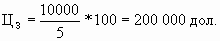 Например, земельный собственник получает ренту в объеме 10000 дол., а норма ссудного процента составляет 5 %, тогда цена земли (Цз) будет равна: