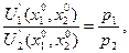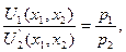 получим что в точке (х10, х20) локального рыночного равновесия индивидуума отношение предельных полезностей U1́(х10, х20) и U2́(х10, х20) продуктов равно отношению рыночных цен р1 и р2 на эти продукты: