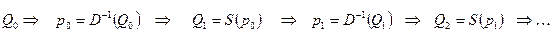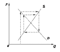 Эту задачу можно решить графическим, получив рисунок типа «паутины». Задав некоторое первоначальное количество товара и цену, не совпадающие с точкой равновесия, будем последовательно наносить точки в соответствии с процедурой расчета по модели, соединяя их горизонтальными и вертикальными прямыми.