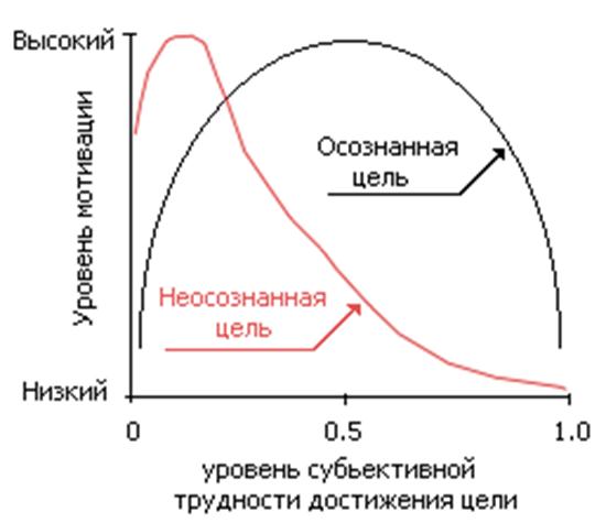 Если рассмотреть эту зависимость с точки зрения теории ожидания, то можно сказать, что при высоких ожиданиях З—Р индивид оценивает вероятность того, что цель достижима, как весьма высокую. В то же время мотивация в этом случае очень низка. По мере уменьшения ожиданий З—Р, т. е. когда цель всё больше воспринимается как отнюдь нелегкая задача, мотивация усиливается до момента, когда возникают серьезные сомнения в достижимости цели. Мотивация исчезает окончательно к моменту осознания полного отсутствия возможности достижения цели.