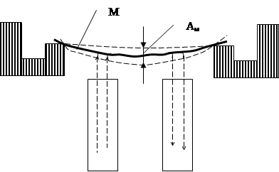 В обмотке О протекает разговорный переменный ток. В зависимости от направления этого тока, создаваемый им переменный магнитный поток либо увеличивает начальную силу притяжения мембраны, либо уменьшает ее. В результате возникают колебания мембраны с амплитудой Ам, что приводит к возникновению звуковых колебаний. Так происходит преобразование телефоном электрических колебаний в звуковые. Постоянный магнит позволяет повышать чувствительность телефона и снижать нелинейные искажения. Без постоянного магнита мембрана притягивается к якорю электромагнита как при положительной так и при отрицательной полуволнах тока. Это удваивает частоту ее колебаний в сравнении с частотой проходящего по обмоткам телефона тока. Следовательно удваивается частота передаваемой речи, что приводит к потере естественности голоса при телефонной передаче. Кроме того, амплитуда колебаний мембраны в этом случае незначительна и акустический эффект был бы минимален. Постоянный магнит обеспечивает преобразование электрических колебаний в звуковые с частотой, соответствующей частоте тока, протекающего по обмоткам телефона. При этом минимальные допустимые нелинейные искажениях составляют 2-3%, и достигается максимальный акустический эффект.