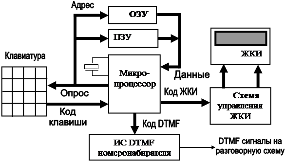 Управление дисплеем осуществляется с помощью микропроцессора (МП). Помимо управления дисплеем, МП обрабатывает сигналы, поступающие с клавиатуры. При этом каждое нажатие на клавишу сначала обрабатывается МП, а лишь затем передается схеме номеронабирателя.