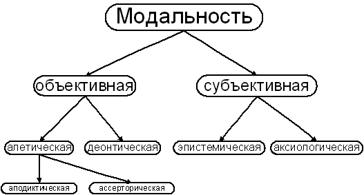 Завершим наш краткий обзор теории модальности в логике схемой, призванной наглядно подытожить сказанное.