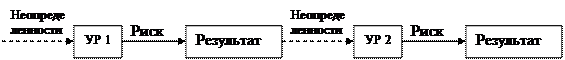 Риск и неопределенность имеют одни и те же корни и измеряются в одних и тех же единицах. Кроме того, они могут переходить друг в друга. Переход неопределенностей в риски рассмотрен выше. Переход рисков в неопределенности происходит в том случае, если имеется несколько УР, следующих друг за другом, тогда риски предшествующих УР становятся неопределенностями для последующих УР (рис. 2).