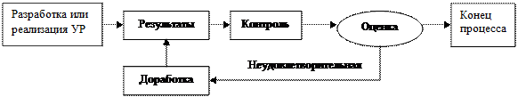 Контроль по результатам осуществляется на базе организационной, технической, экономической, финансовой и другой документации. Оценивается отклонение фактического результата от планового, зафиксированного в соответствующих документах. Например, контроль сроков, проработанности, согласованности с заинтересованными сторонами элементов бизнес-плана. Данный вариант контроля эффективен для циклических процессов с малым временем цикла, например, несколько часов или дней, при небольшой стоимости разработки или реализации УР. Путем корректировок УР можно постепенно, «цикл за циклом» совершенствовать УР, анализируя предыдущий результат разработки или реализации (рис. 1).