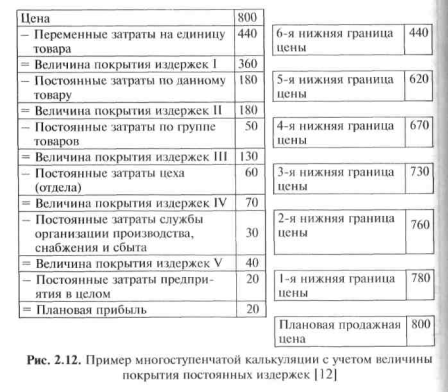 В дополнение к постатейной калькуляции полных затрат может осуществляться расчет величины покрытия постоянных из4 держек, чтобы лица, ведущие переговоры с заказчиками, имели в распоряжении детальную информацию о возможном диапазоне цен на продукцию предприятия. Пример многоступенчатой калькуляции с учетом величины покрытия постоянных издержек приведен на рис. 2.12. В предельном случае, когда полное покрытие