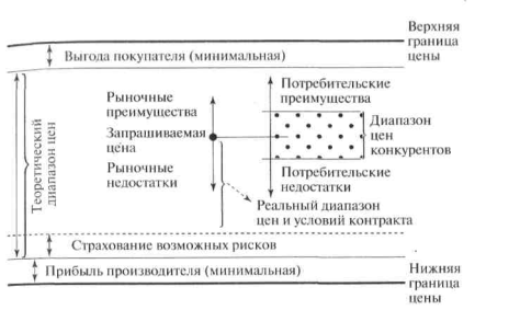 В результате образуется диапазон цен, в котором могут находиться и конкурентные товары или услуги с реальными ценами. Цена может изменяться как в сторону увеличения, так и снижения в зависимости от того, какие потребительские преимущества и недостатки имеют, с точки зрения заказчика, товары предприятия по сравнению с аналогичными товарами конкурентов. Следует также принимать во внимание рыночные конкурентные преимущества и