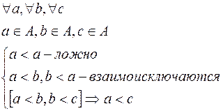 Особенности природы элементов множества в большинстве случаев позволяют установить между ними отношения полного (или совершенного) порядка. Это отношение по определению обладает следующими свойствами: