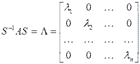 Теорема. Предположим, что квадратная матрица -го порядка имеет линейно независимых собственных векторов. Тогда если взять эти векторы в качестве столбцов матрицы, то матрица будет диагональной матрицей, у которой на диагонали стоят собственные значения матрицы, т.е.