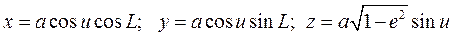 Для определения положения точки Q на поверхности эллипсоида в сфероидической геодезии используют системы пространственных координат: геодезические (B), приведенные (u) и геоцентрические (Ф) широты и геодезические долготы L, а также декартовые координаты x, y, z. На рисунке 3. 1 меридианный эллипс определяемой точки PQ. Из сравнения рисунков 3. 1 и 3. 2 замечаем следующие уравнения связи прямоугольных пространственных x, y, z и в плоскости меридианного эллипса (x), (y) координат