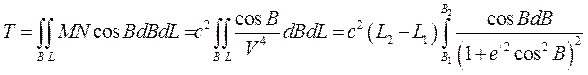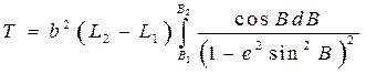 Пусть мы имеем такую сфероидическую трапецию. Тогда площадь поверхности эллипсоида, ограниченная парами меридианов и параллелей определяется двойным интегралом