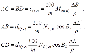 Рис. 4. 4 | выми сторонами – изображения меридианов эллипсоида. Для вычисления их длин воспользуемся ранее полученными формулами для малой дуги меридиана и параллели (4. 31, 4. 32), при этом будем иметь в виду, что карта масштаба 1: m, линейные параметры эллипсоида даны в метрах. С учетом этого имеем |