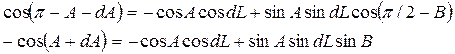 Обратимся теперь к треугольнику РTК. Не смотря на то, что одна из его сторон T К бесконечно мала, стороны РT и РК могут достигать значительных величин, зависящих от значения широты точки Т. В этом случае мы можем рассматривать его как сферический и решать по формулам сферической тригонометрии. Рассмотрим элементы этого треугольника. Угол при вершине Р равен dL, при вершине T – азимут А, сторона РТ выражается на сфере единичного радиуса как (p / 2 - В). Угол этого треугольника при вершине К можем определить как (p - А – d A), так как азимут геодезической линии в точке К равен (A + dA).