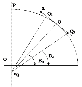 Рис. 7. 5 | Здесь за длину дуги осевого меридиана PQ, заключенного между точками Q1 и Q2 принимается дуга окружности радиусом, равным среднему радиусу кривизны эллипсоида в точке Q с широтой В0, который имеет известное нам выражение через главные радиусы кривизны эллипсоида . Из рисунка получаем связь между длиной дуги окружности и ее касательной. Длина дуги окружности, заключенной между симметрично расположенными, относительно центральной, точками Q1 и Q2 (для изображаемой области) выражается уравнением |