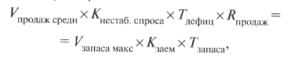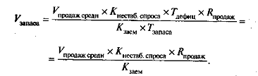 Например, если по итогам двух последних лет коэффициент нестабильности спроса для большинства товаров ассортимента фирмы не превышал 0,3 (т.е. максимальные продажи превышали средние в 1,3 раза), а стоимость привлечения заемных средств составила 12% годовых в твердой валюте, т.е. 1% или 0,01 для периода в 1 месяц, рентабельность продаж основного ассортимента фирмысоставляла 10%, тогда: Vзапаса макс=Vcред. Продаж*0,1*0,3/0,01=3Vсред продаж