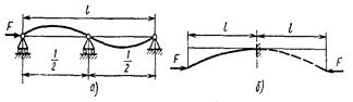 Величина Fкp зависит от условий закрепления стержня, характера нагружения и формы сечений (момента инерции) стержня. Например, если шарнирно закрепленный стержень связать с еще одной опорой посередине (а), то при потере устойчивости он изогнется по двум полуволнам (как двухопорный стержень длиной 1/2) и Fкр = p²EJ/(0,5l)²