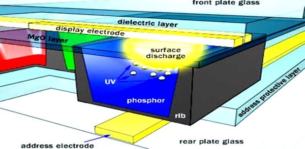 Смесь газов – ксенона и неона содержится в сотнях тысяч крошечных ячейках, расположенных между двумя стеклянными пластинами. Прозрачные дисплейные электроды зажаты между пластинами, изготовленными из изоляционных материалов с защитным слоем из окиси магния. Дисплейные электроды расположены выше ячейки и проходят вдоль внутренней стороны стеклянной пластины. Адресные электроды расположены ниже ячейки и проходят вдоль задней стеклянной пластины, то есть, расположены крест- накрест.