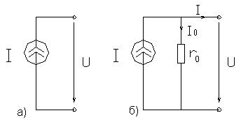 Идеальным источником тока называется активный элемент, который поддерживает во внешней цепи ток, не зависящий от напряжения на его зажимах. Внутреннее сопротивление идеального источника тока r0=∞. Для изображения