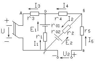 Рис 1.17 электрической цепи, схема которой изображена на рисунке 1.17 с известными сопротивлениями и величинами и направлениями источников э.д.с. и напряжений. Поскольку данная цепь имеет пять ветвей с неизвестными токами, необходимо составить пять уравнений. Выбрав положительные направления токов в ветвях, для узлов «а» и «б» составим уравнения по первому закону Кирхгофа, а для контуров «агда», «абга» и «бвгб» при обходе последних по часовой стрелке - уравнения по второму закону Кирхгофа.