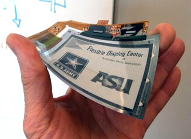 В 2009 году исследователи из центра разработки гибких дисплеев (Flexible Display Center, FDC) Аризонского университета разработали гибкий сенсорный экран с активной матрицей. В основе новинки лежит технология активной матрицы от E-Ink Corp, но вместо традиционного стекла используется гибкая подложка DuPont Teijin Films. Это позволило устранить один из самых главных недостатков сенсорных панелей – их хрупкость. Кроме этого, гибкий дисплей от FDC потребляет энергию только в момент перерисовывания картинки (Рис. 5).