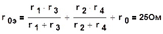 После замены источников их внутренними сопротивлениями получим схему, изображенную на рисунке 1.29в, Между точками а и b последовательно соединены три участка цепи: участок с параллельно соединенными резисторами r1 и r3; участок, на котором параллельно соединены резисторы r2 и r4, и участок, содержащий резистор ro. В соответствии с этим, внутреннее сопротивление эквивалентного генератора (сопротивление относительно точек а и b) будет: