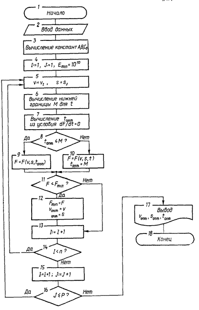 оптимальные значения toпmij. Проверяется выполнение условия toпm £ M, вытекающего из технических ограничений. В случае невыполнения этого условия принимается toпm=M. Затем перебором находится минимум оценочной функции из чисел F(vi, sj, toпmij). Этот подход использован при построении схемы алгоритма оптимизации режимов механической обработки для дискретных значений параметров v, s и глубины резания t (рис. 10.5).