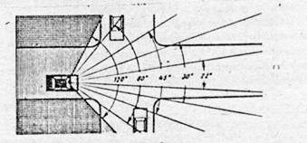 Как отмечалось (п.р.2.2) при неподвижном положении тела и глаз поле в горизонтальной плоскости составляет 120 градусов. При скорости 20 км/ч поле зрения суживается до 80, при 40 км/ч - до 45, при 80 км/ч - до 30, при 100 км/ч - до 22, при 160 км/ч - до 5 градусов(рис.3.1). За пределами этих секторов водитель ничего увидеть не может. В результате увеличивается опасность столкновения или наезда на объекты, которые перемещаются с обочины дороги к ее центру.