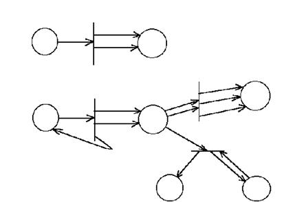 Позиции изображаются окружностями, переходы - отрезками прямой. Каждая дуга связывает вершины только разных классов.