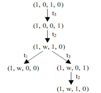 3. Для любого перехода tj, из множества T, разрешенных в разметке m (x), создать новую вершину z дерева достижимости. Разметка m(z), связанная с этой вершиной, определяется для каждой позиции рi следующим образом: