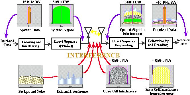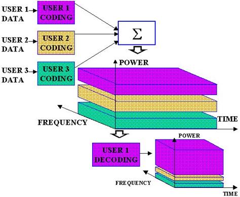 · Самоподавление. Если все мобильные пользователи синхронизированы не идеально, данные, поступающие от разных пользователей, не будут идеально выровнены по границам раздробленных кодов. Расширенные последовательности разных пользователей не будут ортогональными, поэтому будет присутствовать некоторая взаимная корреляция. Это отличает данную схему от FDMA и TDMA, в которых существуют защитные временные или частотные интервалы, соответственно, т.е. сигналы являются хотя бы приближенно ортогональными.