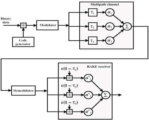 На рис. 2 проиллюстрирован принцип действия RAKE-приемника. Исходный двоичный сигнал расширяется с помощью применения к нему и раздробленному коду передатчика операции исключающего ИЛИ (XOR). Затем расширенная последовательность модулируется для передачи по беспроводному каналу связи. Из-за эффектов многолучевого распространения в канале оказывается много копий сигнала, каждая из которых имеет свое время задержки (τ1, τ2, и т.д.) и свой коэффициент затухания (а1, а2 и т.д.). В приемнике полученный сигнал демодулируется. Демодулированный поток элементов сигнала затем подается на блок корреляторов, причем каждый задерживается на определенную величину (свою для каждого сигнала). Затем сигналы суммируются с весовыми коэффициентами, подходящими для данного канала.