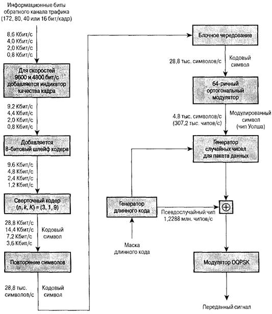 На рис. 5 показаны этапы обработки данных, передаваемых по обратному информационному каналу при скорости, соответствующей первому набору. Первые несколько шагов те же, что и для прямого канала. Для обратного канала сверточный кодер имеет степень кодирования 1/3, т.е. эффективная скорость передачи данных утраивается до максимального значения 28,8 Кбит/с. Затем применяется блочное чередование данных.