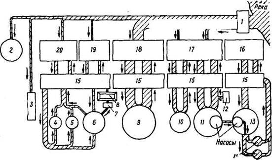 Рис. 11.3 - Оборотная схема: 1 - береговая насосная станция; 2 - коксохимическое производство; 3 - мелкие потребители; 4 - компрессорная; 5 - электросталеплавильный цех; 6 - прокатные цехи; 7 - насосная станция оборотного цикла водоснабжения прокатных станов; 8 - отстойник прокатных цехов; 9 - теплоэлектроцентраль, паровоздуходувная станция и кислородная станция; 10-мартеновский цех; 11 - доменный цех; 12 - разливочные машины; 13 - доменная газоочистка; 14 - радиальные отстойники; 15 - насосная станция; 16 - охладитель газоочистки; 17 - охладитель доменного и мартеновского цехов; 18 - охладитель ТЭЦ, ПВС и кислородной станции; 19 - охладитель грязного цикла; 20 - охладитель чистого цикла