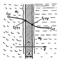 При установившемся процессе количество теплоты Q, передаваемое в единицу времени через площадку F от ядра потока горячего теплоносителя к стенке, равно количеству теплоты, передаваемому через стенку теплопроводностью и от стенки к ядру потока холодного теплоносителя. Это количество теплоты можно определить: