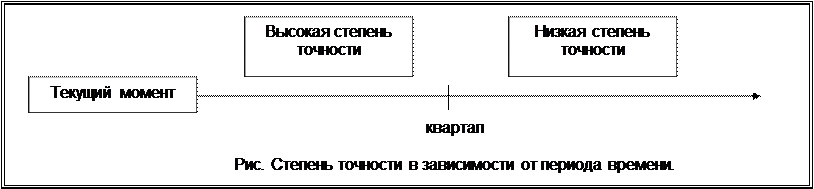 ► Определяется многими как внутрифирменными факторами, так и внешним ее окружением. Планы должны быть конкретизированы и детализированы в той степени, в какой позволяют внешние и внутренние условия деятельности предприятия. Степень точности планов возможна любая, но при обеспечении допустимой эффективности производства. При оперативном и краткосрочном планировании требуется более высокая точность плановых показателей, так как такие планы являются инструкциями, определяющими действия людей и коллективов, реализующих эти планы. При стратегическом или долгосрочном планировании можно ограничиться выбором общей цели и составлением приближенных расчетов, потому что количество достоверной информации о будущем очень невелико, а диапазон и скорость изменения постоянно растут.