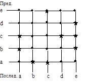 Пример 1.3. Авиационные трассы. Пусть A = { a, b, c, d, e }– множество кодов городов, для определенности a – Астрахань, b – Волгоград, c – Самара, d – Дудинка, е – Екатеринбург. На рис. 1.1 показано декартово пространство в виде двумерной решетки, узлы которой суть все возможные пары городов
