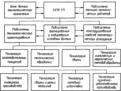 Современная САПР при ее полном развитии должна включать автоматизированное решение всех задач, встречающихся при технологическом проектировании. В случае создания комплексных автоматизированных систем, объединяющих в единый процесс основные этапы проектирования изделий достигается наибольший технико-экономический эффект. Причем для решения каждой задачи предполагается создание отдельной подсистемы автоматизированного проектирования. Примерный состав подсистем, соответствующий современному уровню развития технологии машиностроения, показан на рис. 2.3.