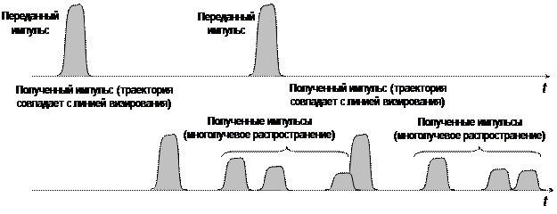 Другим явлением, важным при передаче цифровых данных, является межсимвольная интерференция (intersymbol interference — ISI). Рассмотрим передачу узконаправленного импульсного сигнала заданной частоты по каналу между неподвижной антенной и мобильным устройством. На рис. 10 показано, что может доставить канал, если импульс передается в два разных момента времени. На верхней части рисунка представлены два импульса в момент передачи. В нижней части изображены сигналы, поступающие на приемник. В обоих случаях первый принятый импульс — это желаемый сигнал, пришедший по линии прямой видимости. Мощность это импульса может меняться в зависимости от степени поглощения атмосферой. По мере удаления мобильного устройства от неподвижной антенны атмосферное поглощение прямого сигнала будет возрастать. Однако кроме прямого импульса могут получаться вторичные сигналы, образованные вследствие отражения, дифракции или рассеяния. Предположим, что рассматриваемый импульс содержит один или более закодированных битов информации. В этом случае одна или больше запоздалых копий импульса могут приниматься одновременно с основным импульсом следующего бита. По отношению к следующему импульсу такие запаздывающие импульсы являются шумом, затрудняющим восстановление данных.
