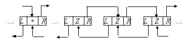Лента МТ представляет своеобразную структуру данных (СД), которая может моделироваться двунаправленным линейным списком, вообще говоря, растущим в обе стороны.