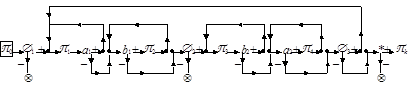 2) Переход после окончания работы над блоком Пi к блоку П J безусловно (по стрелке) либо через распознаватель R по стрелке «+», если условие (предикат) распознавателя выполнено, или по стрелке «–», если условие (предикат) не выполнено. Выполнение/невыполнение условия суть события, на которые БСА реагирует включением того или иного блока.